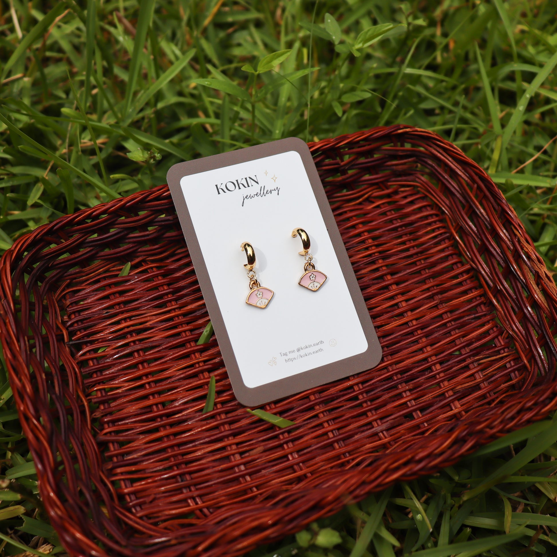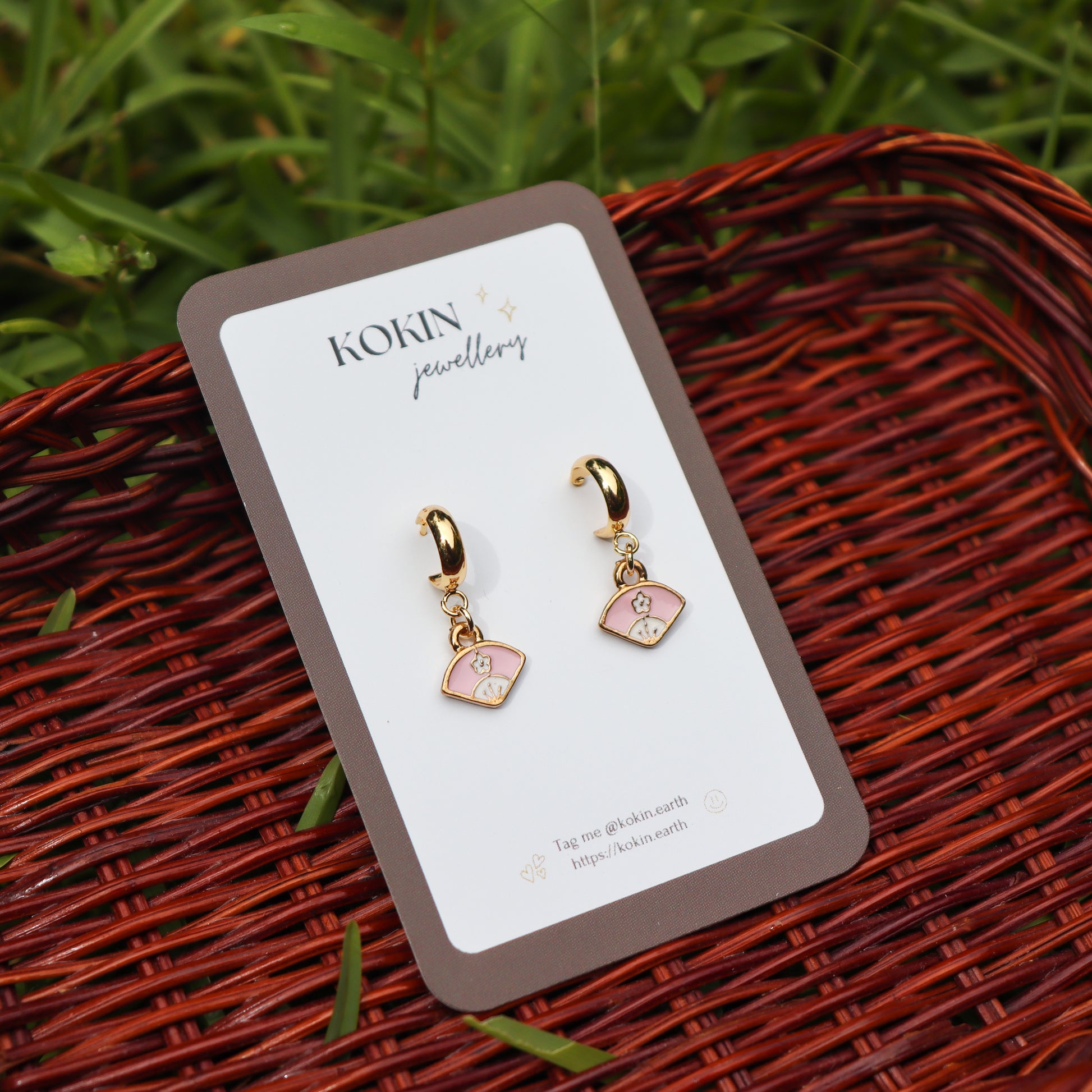 Gold dangle earrings with pink Japanese fans (Ohgi) charms.